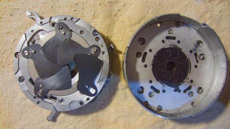 Keywords: Tirando o mecanismo da caixa. A direita as lâminas do obturador, a esquerda a parte do diafragma.