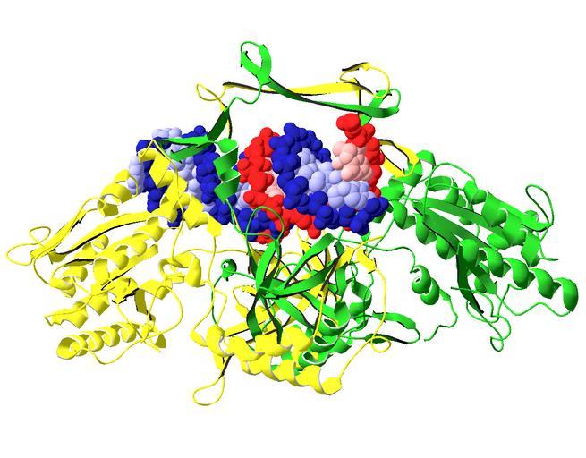 Keywords: Crystal Structure of the Ku Heterodimer - 15.png All beta proteins SPOC domain-like SPOC domain-like Ku70 subunit middle domain Ku70 subunit middle domain Alpha and beta proteins a or b vWA-like vWA-like Ku70 subunit N-terminal domain Ku70 subunit N-terminal domain All beta proteins SPOC domain-like SPOC domain-like Ku80 subunit middle domain Ku80 subunit middle domain Alpha and beta proteins a or b vWA-like vWA-like Ku80 subunit N-terminal domain Ku80 subunit N-terminal domain pl Heterodimer ludzkiego białka Ku przyłączony do nici DNA Ku70 zaznaczono kolorem zielonym Ku80 - żółtym a łańcuchy DNA - czerwonym i niebieskim Do wizualizacji danych krystalograficznych z pliku PDB 1JEY http //www rcsb org/pdb/explore/explore do pdbId 1JEY użyto programu Swiss-PDBViewer 4 0 1 en Human Ku heterodimer protein attached to DNA Ku70 is marked green Ku80 - yellow and the chains of DNA - the red and blue Crystallographic data visualization of the PDB file 1JEY http //www rcsb org/pdb/explore/explore do pdbId 1JEY used the Swiss-PDBViewer 4 0 1 Own 2009-12-21 User Karol007/signature Own work all rights released Public domain Ku protein |