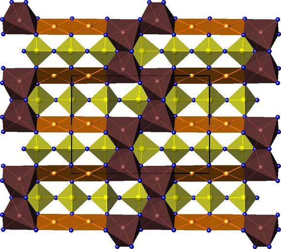 Keywords: Cu2Fe2Ge4O13.jpg en Room temperature structure of Cu<sub>2</sub>Fe<sub>2</sub>Ge<sub>4</sub>O<sub>13</sub> Brown iron orange copper yellow germanium blue oxygen own Perditax 2010-07-03 Copper compounds Crystal structures of iron compounds