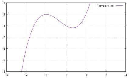 Keywords: Cube 1-x+xx+xxx.svg en Graph of f x 1 - x + x² + x³ function with 1 real and 2 imaginary roots de Graf der kubischen Funktion f x 1 - x + x² + x³ erstellt mit GnuPlot own Emdee 2015-10-05 Cubic polynomials Cc-zero