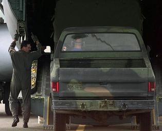 | Keywords: CUCV II Type B Truck loading.jpg A US Air Force USAF C-141B Starlifter aircraft Loadmaster 305th Air Mobility Wing AMW McGuire Air Force Base AFB New Jersey NJ and Rodeo 98 Team member marshals a Commercial Utility Cargo Vehicle CUCV II Type B Truck into the cargo bay of his C-141B during the first half of the Engine Running Onload/Offload ERO competition which is part of the over all USAF AMC sponsored Rodeo 98 airlift competition at McChord AFB Washington WA Location MCCHORD AFB WASHINGTON WA UNITED STATES OF AMERICA USA http //www dodmedia osd mil/ 1998-06-22 SRA JEFFREY ALLEN USAF PD-USGov Chevrolet CUCV McChord Air Force Base Transport of vehicles by Lockheed C-141 Starlifter Air Mobility Rodeo |
