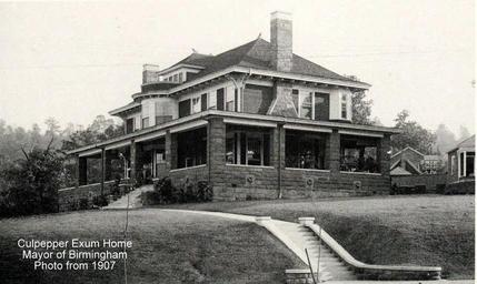 | Keywords: outdoor architecture building Culpepper E. Exum, Sr (born June 19, 1866 in Marion County, South Carolina, died 1920) was a founder and president of the Birmingham Fertilizer Company and the 15th Mayor of Birmingham. His term of office spanned the city's change from a Mayor-Aldermen form of government to a City Commission. Culpepper was the tenth of eleven children born to Robert Benjamin and Mary Jane Culpepper Exum of Marion County (now Florence County), South Carolina. He spent his childhood on the family farm and, at around the age of 10, accompanied his father to Scranton and Charleston, South Carolina, where he attended public schools. Exum completed high school at Oak Ridge, North Carolina and went to work as a clerk at a variety of businesses, including a brokerage of naval stores, a cotton factor, and wholesale grocery house. He and a brother opened a country store in Orangeburg County, but Culpepper soon left to become a traveling salesman for a Baltimore grocery wholesaler, and then a clerk for a Charleston clothing store. Later, while working as a salesman for a wholesale clothing company, he had the opportunity to learn about the owner's other enterprise, a fertilizer factory. Convinced of the potential for that industry, he began representing the Chicora Fertilizing Company in Alabama and Georgia. In 1897 Exum and fellow Chicora salesman Frank Burbridge relocated to Birmingham where they opened their own Birmingham Fertilizer Company. The business was an immediate success and Burbridge left to start another similar firm in Charleston, with Exum as a major shareholder. Meanwhile, Exum's investments also expanded in Birmingham. He became a director of the First National Bank of Birmingham and owned the real estate on which the Alabama State Fairgrounds was developed. In 1904 he was elected president of the Birmingham Chamber of Commerce. As director of the Alabama State Fair Association, he offered the Fair Grounds as a location to display the Vulcan statue after the culmination of the St Louis World's Fair. In 1905 Exum married the former Lestra Kinney. The couple had four children: Lestra K., Culpepper, Jr, Frank K. and Jane. Exum was elected Mayor of Birmingham in 1910. Shortly thereafter a citizen-led legislative change created a Birmingham City Commission to replace the Board of Aldermen. Exum remained in office as President of the Commission until November 1913. Exum served alongside A. O. Lane and James Weatherly on the Commission, which was charged with bringing a "businesslike" competency to City Hall. In order to reign in expenditures and cover a deficit of $583,144 the commissioners abolished several offices and reduced or eliminated certain inefficient city services, including a temporary abolishment of the Department of Parks. They also renegotiated interest payments on the city's deposits by changing banks. The task of consolidating utilities and services provided by the numerous municipalities annexed into the city by the Greater Birmingham act was the primary task of Exum's administration. While in office, Exum organized the Steel Cities Chemical Company. Exum died in 1920. (source: Bhamwiki.com) Culpepper E. Exum, Sr (born June 19, 1866 in Marion County, South Carolina, died 1920) was a founder and president of the Birmingham Fertilizer Company and the 15th Mayor of Birmingham. His term of office spanned the city's change from a Mayor-Aldermen form of government to a City Commission. Culpepper was the tenth of eleven children born to Robert Benjamin and Mary Jane Culpepper Exum of Marion County (now Florence County), South Carolina. He spent his childhood on the family farm and, at around the age of 10, accompanied his father to Scranton and Charleston, South Carolina, where he attended public schools. Exum completed high school at Oak Ridge, North Carolina and went to work as a clerk at a variety of businesses, including a brokerage of naval stores, a cotton factor, and wholesale grocery house. He and a brother opened a country store in Orangeburg County, but Culpepper soon left to become a traveling salesman for a Baltimore grocery wholesaler, and then a clerk for a Charleston clothing store. Later, while working as a salesman for a wholesale clothing company, he had the opportunity to learn about the owner's other enterprise, a fertilizer factory. Convinced of the potential for that industry, he began representing the Chicora Fertilizing Company in Alabama and Georgia. In 1897 Exum and fellow Chicora salesman Frank Burbridge relocated to Birmingham where they opened their own Birmingham Fertilizer Company. The business was an immediate success and Burbridge left to start another similar firm in Charleston, with Exum as a major shareholder. Meanwhile, Exum's investments also expanded in Birmingham. He became a director of the First National Bank of Birmingham and owned the real estate on which the Alabama State Fairgrounds was developed. In 1904 he was elected president of the Birmingham Chamber of Commerce. As director of the Alabama State Fair Association, he offered the Fair Grounds as a location to display the Vulcan statue after the culmination of the St Louis World's Fair. In 1905 Exum married the former Lestra Kinney. The couple had four children: Lestra K., Culpepper, Jr, Frank K. and Jane. Exum was elected Mayor of Birmingham in 1910. Shortly thereafter a citizen-led legislative change created a Birmingham City Commission to replace the Board of Aldermen. Exum remained in office as President of the Commission until November 1913. Exum served alongside A. O. Lane and James Weatherly on the Commission, which was charged with bringing a "businesslike" competency to City Hall. In order to reign in expenditures and cover a deficit of $583,144 the commissioners abolished several offices and reduced or eliminated certain inefficient city services, including a temporary abolishment of the Department of Parks. They also renegotiated interest paym