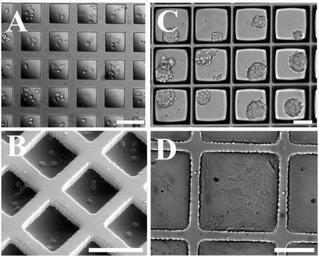 | Keywords: Culture of cells on 1009F and PS-AA microraft arrays.png en Culture of cells on 1009F and PS-AA microraft arrays A brightfield and B SEM images of HeLa cells cultured on a 70 μm 1009F microraft array inter-raft spacing 30 μm; microraft height 15 μm C Mouse embryonic stem cell and D primary cells isolated from a pancreatic needle biopsy cultured on arrays composed of 200 μm PS-AA microrafts inter-raft spacing 20 μm; microraft height 25 μm Scale bar is 100 μm 2013-03-29 12 08 30 http //www ncbi nlm nih gov/pmc/articles/PMC2994190/ Yuli Wang Colleen Phillips Wei Xu Jeng-Hao Pai Rahul Dhopeshwarkar Christopher E Sims and Nancy Allbrittona PD-USGov Uploaded with UploadWizard Uncategorized 2013 March 29 |