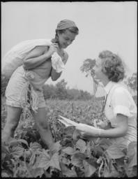 | Keywords: Cumber County, Maine. Alice Whitten, VFV girl student of Deering High School, Portland, checking in beans with Miss... - NARA - 513404.tif Scope and content General notes 513404 Local identifier 33-S-12192 Department of Agriculture Extension Service 06/17/1981 - 1995 Still Picture Records Section Special Media Archives Services Division NWCS-S National Archives at College Park 8601 Adelphi Road College Park MD 20740-6001 08/1944 Record group Record Group 33 Records of the Extension Service 1888 - 2000 Record group ARC 362 Extension and Home Demonstration Activities compiled 1920 - 1954 Series ARC 513400 File unit File unit ARC Variant control numbers NAIL Control Number NWDNS-33-S-12192 yes Other versions NARA-cooperation PD-USGov Education in Portland Maine Bean fields People of Portland Maine Adolescent girls in the United States Educators from the United States August 1944 20th-century women of the United States Victory Farm Volunteers High school students in the United States Black and white portrait photographs of adolescent girls Black and white photographs Students in Maine Children gardening |