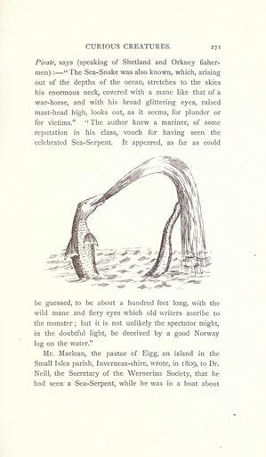 | Keywords: Curious creatures in zoology (15569484002).jpg CURIOUS CREATURES <br> 271 <br> Pirate says speaking of Shetland and Orkney fisher- <br> men The Sea-Snake was also known which arising <br> out of the depths of the ocean stretches to the skies <br> his enormous neck covered with a mane like that of a <br> war-horse and with his broad glittering eyes raised <br> mast-head high looks out as it seems for plunder or <br> for victims The author knew a mariner of some <br> reputation in his class vouch for having seen the <br> celebrated Sea-Serpent It appeared as far as could <br> be guessed to be about a hundred feet long with the <br> wild mane and fiery eyes which old writers ascribe to <br> the monster ; but it is not unlikely the spectator might <br> in the doubtful light be deceived by a good Norway <br> log on the water <br> Mr Maclean the pastor of Eigg an island in the <br> Small Isles parish Inverness-shire wrote in 1809 to Dr <br> Neill the Secretary of the Wernerian Society that he <br> had seen a Sea-Serpent while he was in a boat about 23575026 76213 32031 Page 271 Text http //www biodiversitylibrary org/page/23575026 1890 10 5962/bhl title 32031 Ashton John Biodiversity Heritage Library Curious creatures in zoology; with 130 illus throughout the text Sea Serpents Monsters Are Real Animals University of California Libraries archive org bhl page 23575026 dc identifier http //biodiversitylibrary org/page/23575026 bhlMonstersRreal Halloween sea serpent university of california libraries archive org bhlmonstersrreal Information field Flickr posted date ISOdate 2014-10-19 CC-BY-2 0 BioDivLibrary https //flickr com/photos/61021753 N02/15569484002 2015-08-25 20 53 51 cc-by-2 0 PD-old-70-1923 sea serpent Curious creatures in zoology Photos uploaded from Flickr by Fæ using a script |