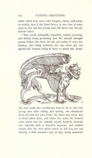 | Keywords: Curious creatures in zoology (15569390162).jpg 164 CURIOUS CREATURES <br> earth which they cover with boughes sticks and earth <br> so weakly that if the beast chance at any time to come <br> upon it she and her young ones fall down into the pit <br> and are taken <br> This cruell untamable impatient violent ravening <br> and bloody beast perceiving that her natural strength <br> cannot deliver her from the wit and policy of men her <br> hunters for being inclosed she can never get out <br> againe the hunters being at hand to watch her down- <br> fall and worke her overthrowe first of all to save her <br> young ones from taking and taming she destroyed <br> them all with her own teeth ; for there was never any <br> of them taken alive and when she seeth the hunters <br> come about her she roareth cryeth howleth brayeth <br> and uttereth such a fearefull noysome and terrible <br> clamor that the men which watch to kill her are not <br> thereby a little amazed; but at last being animated 23574919 76213 32031 Page 164 Text http //www biodiversitylibrary org/page/23574919 1890 10 5962/bhl title 32031 Ashton John Biodiversity Heritage Library Curious creatures in zoology; with 130 illus throughout the text Monsters Are Real Animals University of California Libraries archive org bhl page 23574919 dc identifier http //biodiversitylibrary org/page/23574919 bhlMonstersRreal Halloween university of california libraries archive org bhlmonstersrreal Information field Flickr posted date ISOdate 2014-10-19 CC-BY-2 0 BioDivLibrary https //flickr com/photos/61021753 N02/15569390162 2015-08-25 21 54 36 cc-by-2 0 PD-old-70-1923 Curious creatures in zoology Photos uploaded from Flickr by Fæ using a script |