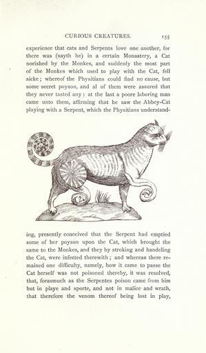 | Keywords: Curious creatures in zoology (15544847406).jpg CURIOUS CREATURES 155 <br> experience that cats and Serpents love one another for <br> there was sayth he in a certain Monastery a Cat <br> norished by the Monkes and suddenly the most part <br> of the Monkes which used to play with the Cat fell <br> sicke ; whereof the Physitians could find no cause but <br> some secret poyson and al of them were assured that <br> they never tasted any at the last a poore laboring man <br> came unto them affirming that he saw the Abbey-Cat <br> playing with a Serpent which the Physitians understand- <br> ing presently conceived that the Serpent had emptied <br> some of her poyson upon the Cat which brought the <br> same to the Monkes and they by stroking and handeling <br> the Cat were infected therewith ; and whereas there re- <br> mained one difficulty namely how it came to passe the <br> Cat herself was not poisoned thereby it was resolved <br> that forasmuch as the Serpentes poison came from him <br> but in playe and sporte and not in malice and wrath <br> that therefore the venom thereof being lost in play 23574910 76213 32031 Page 155 Text http //www biodiversitylibrary org/page/23574910 1890 10 5962/bhl title 32031 Ashton John NameFound Serpentes NameConfirmed Serpentes EOLID 2815988 NameBankID 2549786 Biodiversity Heritage Library Curious creatures in zoology; with 130 illus throughout the text Monsters Are Real Animals University of California Libraries archive org bhl page 23574910 dc identifier http //biodiversitylibrary org/page/23574910 bhlMonstersRreal Halloween university of california libraries archive org bhlmonstersrreal Information field Flickr posted date ISOdate 2014-10-19 CC-BY-2 0 BioDivLibrary https //flickr com/photos/61021753 N02/15544847406 2015-08-25 21 53 54 cc-by-2 0 PD-old-70-1923 Curious creatures in zoology Photos uploaded from Flickr by Fæ using a script |