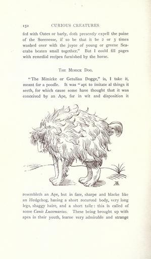 | Keywords: Curious creatures in zoology (15565878441).jpg i 5 o CURIOUS CREATURES <br> fed with Gates or barly doth presently expell the paine <br> of the Sorenesse if so be that it be 2 or 3 times <br> washed over with the juyce of young or greene Sea- <br> crabs beaten small together But I could fill pages <br> with remedial recipes furnished by the horse <br> THE MIMICK DOG <br> The Mimicke or Getulian Dogge is I take it <br> meant for a poodle It was apt to imitate al things it <br> seeth for which cause some have thought that it was <br> conceived by an Ape for in wit and disposition it <br> resembleth an Ape but in face sharpe and blacke like <br> an Hedgehog having a short recurved body very long <br> legs shaggy haire and a short taile this is called of <br> some Cam's Lucernarius These being brought up with <br> apes in their youth learne very admirable and strange 23574905 76213 32031 Page 150 Text http //www biodiversitylibrary org/page/23574905 1890 10 5962/bhl title 32031 Ashton John NameFound Lucernarius Biodiversity Heritage Library Curious creatures in zoology; with 130 illus throughout the text Monsters Are Real Animals University of California Libraries archive org bhl page 23574905 dc identifier http //biodiversitylibrary org/page/23574905 bhlMonstersRreal Halloween university of california libraries archive org bhlmonstersrreal Information field Flickr posted date ISOdate 2014-10-19 CC-BY-2 0 BioDivLibrary https //flickr com/photos/61021753 N02/15565878441 2015-08-25 21 54 20 cc-by-2 0 PD-old-70-1923 Curious creatures in zoology Photos uploaded from Flickr by Fæ using a script |
