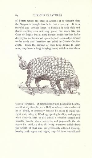 | Keywords: Curious creatures in zoology (15565855051).jpg 84 CURIOUS CREATURES <br> of Beasts which are bred in Affricke it is thought that <br> the Gorgon is brought foorth in that countrey It is a <br> feareful and terrible beast to behold it hath high and <br> thicke eie-lids eies not very great but much like an <br> Oxes or Bugils but all fiery bloudy which neyther looke <br> directly forwarde nor yet upwards but continuallye downe <br> to the earth and therefore are called in Greeke Catoble- <br> ponta From the crowne of their head downe to their <br> nose they have a long hanging mane which makes them <br> to look fearefully It eateth deadly and poysonfull hearbs <br> and if at any time he see a Bull or other creature whereof <br> he is afraid he presently causeth his mane to stand up- <br> right and being so lifted up opening his lips and gaping <br> wide sendeth forth of his throat a certaine sharpe and <br> horrible breath which infecteth and poysoneth the air <br> above his head so that all living creatures which draw <br> the breath of that aire are greevously afflicted thereby <br> loosing both voyce and sight they fall into leathall and 23574839 76213 32031 Page 84 Text http //www biodiversitylibrary org/page/23574839 1890 10 5962/bhl title 32031 Ashton John Biodiversity Heritage Library Curious creatures in zoology; with 130 illus throughout the text Monsters Are Real Animals University of California Libraries archive org bhl page 23574839 dc identifier http //biodiversitylibrary org/page/23574839 bhlMonstersRreal Halloween university of california libraries archive org bhlmonstersrreal Information field Flickr posted date ISOdate 2014-10-19 CC-BY-2 0 BioDivLibrary https //flickr com/photos/61021753 N02/15565855051 2015-08-25 21 51 42 cc-by-2 0 PD-old-70-1923 Curious creatures in zoology Photos uploaded from Flickr by Fæ using a script |