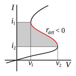 | Keywords: Current controlled negative resistance.svg negative resistance CCNR It shows a device with negative differential resistance meaning the voltage decreases with increasing current in some parts of the graph colored <font color red >red</font> It is a variety called current controlled negative resistance which means the voltage is a single-valued function of the current The curve is also called S-type because it is shaped vaguely like the letter S with a single negative resistance region along the current axis shaded sandwiched between two positive resistance regions 2012-07-19 own Chetvorno cc-zero Uploaded with UploadWizard Negative resistance Device current-voltage characteristics |