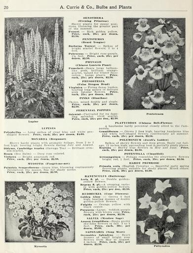 | Keywords: Currie's bulbs and plants (Page 20) (16363874046).jpg 20 <br> A Currie Co Bulbs and Plants <br> OENOTHERA <br> Evening Primrose <br> Showy plants for sunny posi- <br> tions blooming the greater part <br> of the summer <br> Fraseri Rich golden yellow <br> Price eacli 25c; per dozen <br> 2 50 <br> PENTSTEMON <br> Beard Tongue <br> Barbatus Torreyi Spikes of <br> bright scarlet flowers 3 to 4 <br> feet <br> Pubescens Bright rosy-purple <br> l / feet Price each 25c; per <br> dozen 2 50 <br> PHYSALIS <br> Chinese Lantern Plant <br> Francheti Bears large balloon- <br> like pods brilliant orange- <br> scarlet valued for winter deco- <br> ration Large plants Price <br> each 25c; per dozen 2 50 <br> PHYSOSTEGIA <br> False Dragon Head <br> Virginica Forms dense bushes <br> bearing long spikes of delicate <br> pink tubular flowers Price <br> each 25c; per dozen 2 50 <br> PINKS Dianthus <br> Choice mixed double and <br> Price each 25c; per <br> 2 50 <br> PERENNIAL POPPIES <br> Oriental Unrivaled for its dazz- <br> ling splendor vivid scarlet <br> Price each 25c; per doz 2 50 <br> single <br> dozen <br> Pentstenion <br> Lupine <br> LUPINES <br> Polyphyllus Long spikes of clear blue and white pea- <br> shaped flowers Price each 35c; per dozen 4 00 <br> MONARDA Bergamot <br> Showy hardy plants with aromatic foilage from 2 to 3 <br> feet high bearing bright flowers during July and August <br> Didyma Cambridge Scarlet Osv/ego Tea Brilliant crim- <br> son-scarlet <br> Rosea Bee Balm Deep rose colored <br> Violacea Bright amaranth red <br> Price each 25c; per dozen 2 50 <br> MYOSOTIS Forget-me-not <br> Palustris Semperflorens Azure blue blooming continuously <br> throughout the season fine for shady nooks <br> Price each 25c; per dozen 2 50 <br> PLATYCODON Chinese Bell-Flower <br> A handsome hardy perennial closely allied to the Cam- <br> panula <br> Grandiflorum Grows 3 feet high bearing handsome blue <br> and white bell-shaped flowers continuously all summer <br> Price each 25c; per dozen 2 50 <br> POLEMONIUM Jacob's Ladder <br> Spikes of showy flowers and deep green finely cut foil- <br> age 12 inches high succeeding best in partially shady places <br> Reptans Showy blue flowers in May and June Price <br> each 25c; per dozen 2 50 <br> POTENTILLA Cinqnifoil <br> Atrosanguinea Foliage resembles the strawberry flowers <br> bright red 1 foot Price each 35c; per dozen 3 50 <br> HARDY PRIMROSE <br> Primula veris English Cowslip Beautiful early spring <br> flowering plants suitable for shady places Mixed colors <br> Price each 30c; per dozen 3 00 <br> Myosotis <br> RANUNCULUS Buttercup <br> Acris 11 pi Double golden- <br> yellow flowers <br> Repens fl pi A creeping varie- <br> ty with golden-yellow flowers <br> Price each 25c; per doz 2 50 <br> RUDBECKIA Cone Flowers <br> Golden Glow Grows 6 feet <br> high bearing masses of double <br> golden-yellow flowers <br> Fulgida Orange yellow with <br> black center <br> Purpurea Large reddish -purple <br> flowers with brown cone Price <br> each 25c; per lozen 2 50 <br> SALVIA Meadow Sage <br> Azurea Grandiflora rBears pretty <br> sky-blue flowers in fall 3 to 4 <br> feet Price each 30c; per <br> dozen 3 00 <br> SAPONARIA Soap Wort <br> Ocymoides Splendens Bears <br> masses of small bright rose <br> flowers from May to August <br> 8 inches Price each 25c; per <br> dozen 2 50 <br> Paltycodon 42227743 133132 65947 Page 20 Text http //www biodiversitylibrary org/page/42227743 1913 10 5962/bhl title 65947 Currie Brothers Company ; Henry G Gilbert Nursery and Seed Trade Catalog Collection NameFound Acris NameConfirmed ACRIS EOLID 35904 NameBankID 2475474 NameFound Azurea NameConfirmed Azurea NameBankID 2999179 NameFound Barbatus NameConfirmed Barbatus EOLID 4548161 NameBankID 176155 NameFound Dianthus NameConfirmed Dianthus EOLID 11254753 NameBankID 2646562 NameFound Didyma NameConfirmed Didyma EOLID 27541 NameBankID 4143070 NameFound Fulgida NameConfirmed Fulgida NameBankID 4400999 NameFound Grandiflora NameFound Grandiflorum NameFound Monarda NameConfirmed Monarda EOLID 37998 NameBankID 4935185 NameFound MYOSOTIS NameConfirmed Myosotis EOLID 40769 NameBankID 2654540 NameFound Oenothera NameConfirmed Oenothera EOLID 11173937 NameBankID 2651297 NameFound Palustris NameConfirmed Palustris Hust J W G Lund NameBankID 5332955 NameFound Pentstemon NameConfirmed Pentstemon Schmidel EOLID 23988214 NameBankID 8584742 NameFound Physalis NameConfirmed Physalis EOLID 11196159 NameBankID 1761345 NameFound Physostegia NameConfirmed Physostegia EOLID 60913 NameBankID 2655057 NameFound Platycodon NameConfirmed Platycodon A DC EOLID 70892 NameFound Polemonium NameConfirmed Polemonium L EOLID 40653 NameFound Polyphyllus NameFound Potentilla NameConfirmed Potentilla EOLID 29912 NameBankID 2649889 NameFound Primula veris NameConfirmed Primula veris EOLID 584034 NameBankID 2649437 NameFound Pubescens NameConfirmed Pubescens NameBankID 5091297 NameFound Purpurea NameConfirmed Purpurea NameBankID 4324074 NameFound Ranunculus NameConfirmed Ranunculus EOLID 37662 NameBankID 2576523 NameFound REPENS NameConfirmed Repens EOLID 20532 NameBankID 2997678 NameFound Rudbeckia NameConfirmed Rudbeckia EOLID 37719 NameBankID 2658106 NameFound Salvia NameConfirmed Salvia L EOLID 38380 NameFound Saponaria NameConfirmed Saponaria EOLID 61449 NameBankID 2646399 NameFound Splendens NameConfirmed SPLENDENS NameBankID 5329910 NameFound Violacea NameConfirmed Violacea NameBankID 5101911 Biodiversity Heritage Library Currie's bulbs and plants autumn 1928 Garden Stories Bulbs Plants Catalogs Flowers Nurseries Horticulture Plants Ornamental Seeds U S Department of Agriculture National Agricultural Library bhl page 42227743 dc identifier http //biodiversitylibrary org/page/42227743 bhlGardenStories Lupine Pentsemon Myostosis Platycodon Currie's BHLinbloom bulbs plants nurseries horticulture plants ornamental u s department of agriculture national agricultural library bhlgardenstories bhlinbloom Information f
