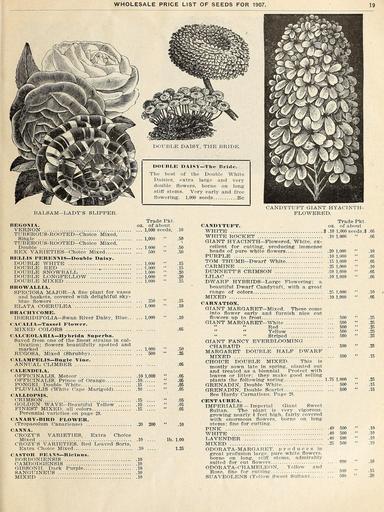 Keywords: Currie's general wholesale catalogue for florists, market gardeners and truckers (Page 19) (15768773033).jpg WHOLESALE PRICE LIST OF SEEDS FOR 1907 <br> 19 <br> BALSAM ” LADY'S SLIPPER <br> BEGOIVIA <br> VERNON <br> TUBflROUS-ROOTED ” Choice Mixed <br> Sing le <br> TUBEROUS ROOTED ” Choice Mixed <br> Double <br> REX VARIETIES ” Choice Mixed <br> Trade Pkt <br> oz of about <br> 1 000 seeds <br> BKLI IS PERENNIS ” Double Daisy <br> DOUBLE WHITE <br> DOUBLE RED <br> DOUBLE SNOWBALL <br> DOUBLE LONGFELLOW <br> DOUBLE MIXED <br> BROWALLIA <br> SPECIOSA MAJOR ” A fine plant for vases <br> and baskets covered with delig-htful sky- <br> blue flowers <br> ELATA COERULEA <br> BRACHYCOME <br> IBERIDIFOLIA ” Swan River Daisy Blue <br> CACALIA ” Tassel Flower <br> MIXED COLORS <br> 1 000 <br> 1 000 <br> 500 <br> 1 000 <br> 1 000 <br> 1 000 <br> 1 000 <br> 1 000 <br> 250 <br> 1 000 <br> 1 000 <br> CALCEOLARIA ” Hytorida Snperba <br> Saved from one of the finest strains in cul- <br> tivation; fiowers beautifully spatted and <br> marked <br> RUGOSA Mixed Shrubby <br> CALAMPBLiIS ” Bwsrle Vine <br> ANNUAL CLIMBER <br> 1 000 <br> 500 <br> CALENDULA <br> OFFICINALIS Meteor <br> OFFICINALIS Prince of Orange <br> PONGEI Double White <br> PLUVIALIS White Cape Marigold <br> CALLIOPSIS <br> CRIMSON <br> GOLDEN WAVE ” Beautiful Yellow <br> FINEST MIXED all colors <br> Perennial varieties on page 28 <br> CANARY-BIRD FLOWER <br> Tropaeolum Canariense <br> CANNA <br> CROZY'S VARIETIES Extra Choice <br> Mixed <br> CROZY'S VARIETIES Red Leaved Sorts <br> Extra Choice Mixed <br> CASTOR BEANS ” Ricinus <br> BORBONIENSIS <br> CAMBODGENSIS <br> GIBSONIL Dark Purple <br> SANGUINEUS <br> MIXED <br> 10 1 000 <br> 10 <br> 15 <br> TO <br> 15 <br> 15 <br> 15 <br> 20 200 <br> 50 <br> 50 <br> 50 <br> 15 <br> 15 <br> 20 <br> 20 <br> 15 <br> 15 <br> 10 <br> 10 <br> 05 <br> 50 <br> 35 <br> 05 <br> 05 <br> 05 <br> 05 <br> 05 <br> 05 <br> 05 <br> 05 <br> 10 <br> 10 <br> lb 1 00 <br> 10 <br> 1 25 <br> 10 <br> 10 <br> 10 <br> 10 <br> 10 <br> CANDYTUFT GIANT HYACINTH- <br> FLOWERED <br> Trfl-dĀ© JPkt <br> CANDYTUFT oz of about <br> WHITE 10 1 000 seeds <br> WHI'TE ROCKET 10 1 000 <br> GIANT HYACINTH ” Flowered White ex- <br> cellent for cutting producing immense <br> heads of pure white flowers 20 1 000 <br> PURPLE 10 1 000 <br> TOM THUMB ” Dwarf White 15 1 000 <br> CARMINE 25 1 000 <br> DUNNETT'S CRIMSON aO 1 000 <br> LILAC 10 1 000 <br> DM ARF HYBRIDS ” Large Flowering; a <br> beautiful Dwarf Candytuft with a great <br> range of colors 25 1 000 <br> MIXED 10 1 000 <br> CARNATION <br> GIANT MARGARET ” Mixed These come <br> into flower early and fvirnish nice cut <br> flowers up to frost <br> GIANT MARGARET ” White <br> Red <br> Yellow <br> Striped <br> GIANT FANCY EVERBLOOMING <br> CHABAUD <br> MARGARET DOUBLE HALF DWARF <br> MIXED <br> CHOICE DOUBLE MIXED This is <br> mostly sown late in spring planted out <br> and treated as a biennial Protect with <br> leaves or litter; they make good selling <br> plants the following spring <br> GRENADIN Double White <br> GRENADIN Double Scarlet <br> See Hardy Carnations Page 28 <br> CENTAUREA <br> IMPERIALIS ” Imperial Giant Sweet <br> Sultan The plant is very vigorous <br> growing nearly 4 feet high fairly covered <br> with enormous flowers borne on long <br> stems; fine for cutting <br> PINK <br> WHITE <br> LAVENDER <br> MIXED <br> ODORATA-MARGARET produces in <br> great profusion large pure white flowers <br> borne on long stiff stems admirably <br> suited for cut flowers <br> ODORATA-CHAMELEON Yellow and <br> Rose fine for cutting <br> SUAVEOLENS Yellow Sweet Sultan <br> 500 <br> 500 <br> 500 <br> 500 <br> 500 <br> 500 <br> 50O <br> 1 75 1 000 <br> 500 <br> 50O <br> 25 <br> 25 <br> 25 <br> 25 <br> 25 <br> 15 <br> 25 <br> 15 <br> 15 <br> 40 <br> 500 <br> 10 <br> 40 <br> 500 <br> 10 <br> 40 <br> 500 <br> 10 <br> 25 <br> 500 <br> 10 <br> 500 <br> 500 <br> 500 <br> 10 <br> 15 <br> 20 42227311 133125 66169 Page 19 Text http //www biodiversitylibrary org/page/42227311 1907 10 5962/bhl title 66169 Currie Brothers Company ; Henry G Gilbert Nursery and Seed Trade Catalog Collection NameFound Brachycome NameConfirmed Brachycome EOLID 6264712 NameBankID 3443227 NameFound Browallia NameConfirmed Browallia L EOLID 60719 NameFound Cacalia NameConfirmed Cacalia L EOLID 2525723 NameBankID 471173 NameFound Calceolaria NameConfirmed Calceolaria EOLID 72303 NameBankID 2665046 NameFound Calendula NameConfirmed Calendula EOLID 59414 NameBankID 25725 NameFound Calliopsis NameConfirmed Calliopsis EOLID 2748143 NameBankID 4099619 NameFound Centaurea NameConfirmed Centaurea L EOLID 59386 NameFound Imperialis NameConfirmed Imperialis NameBankID 4853926 NameFound Lilac NameConfirmed Lilac P Miller 1754 NameFound Pluvialis NameConfirmed Pluvialis EOLID 19929 NameBankID 2473350 NameFound Ricinus NameConfirmed Ricinus L EOLID 107750 NameFound Rugosa NameConfirmed Rugosa EOLID 2552239 NameBankID 492493 NameFound Speciosa major NameFound Tropaeolum NameConfirmed Tropaeolum EOLID 61126 NameBankID 2652525 Biodiversity Heritage Library Bulbs Plants Catalogs Equipment and supplies Flowers Gardening Nurseries Horticulture Plants Ornamental Seeds Vegetables U S Department of Agriculture National Agricultural Library bhl page 42227311 dc identifier http //biodiversitylibrary org/page/42227311 bulbs plants nurseries horticulture plants ornamental u s department of agriculture national agricultural library Information field Flickr posted date ISOdate 2015-01-28 PD-old-70-1923 Currie's general wholesale catalogue for florists market gardeners and truckers Photos uploaded from Flickr by FƦ using a script Files from the Biodiversity Heritage Library released as Attribution-NonCommercial-ShareAlike