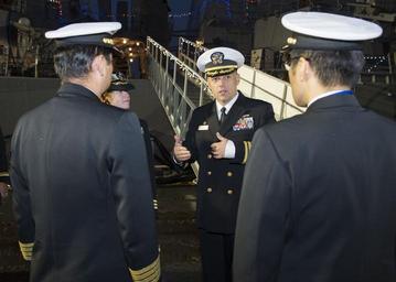 | Keywords: Curtis Wilbur and Kirishima gift exchange 131219-N-TX154-012.jpg en Cmdr Hans De For commanding officer of the guided-missile destroyer USS Curtis Wilbur DDG 54 greets the commanding officer and executive officer of the Japan Maritime Self-Defense Force guided-missile destroyer JS Kirishima DDG 174 during an annual Christmas gift exchange Curtis Wilbur and Kirishima have been sister ships since 1996 when Curtis Wilbur shifted to Yokosuka and have exchanged gifts every year for the past 17 years U S Navy photo by Mass Communication Specialist 3rd Class Paul Kelly/Released <br>Unit Navy Media Content Services 2013-12-19 Petty Officer 3rd Class Paul Kelly https //www dvidshub net/image/1142739/curtis-wilbur-and-kirishima-gift-exchange 131219-N-TX154-012 2013-12-20 19 37 FLEACT YOKOSUKA JP PD-USGov-Military-Navy USS Curtis Wilbur DDG-54 Images from DoD uploaded by Fæ |
