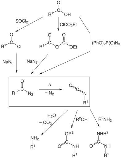 Keywords: Curtius rearrangement overview v1.svg en Overview of the Curtius rearrangement de à berblick der Curtius-Reaktion selbst erstellt mit ChemBioOffice 11 LinuxCLP 2011-08-12 Cc-zero Curtius rearrangement