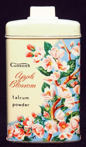 Keywords: Cussons Apple Blossom talcum powder tin, pic1.JPG Very old packaging of a Dutch product that is not produced and not sold any more Photographed at a collector of Droste For info see http //www tincollectors nl/ tincollectors nl or email info tincollectors nl own 2014-04-13 12 57 05 Alf van Beem CC-Zero Trademarked Talcum powder tins