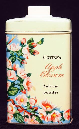 Keywords: Cussons Apple Blossom talcum powder tin, pic4.JPG Very old packaging of a Dutch product that is not produced and not sold any more Photographed at a collector of Droste For info see http //www tincollectors nl/ tincollectors nl or email info tincollectors nl own 2014-04-13 12 57 35 Alf van Beem CC-Zero Trademarked Talcum powder tins