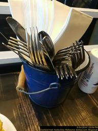 Would you consider inverting the current placement of that cutlery so that the mouth ends of the cutlery is facing inside of the bucket (Given the bucket is cleaned daily)? The handle part of the cutlery would be subjected to rummaging instead of the mouth ends.