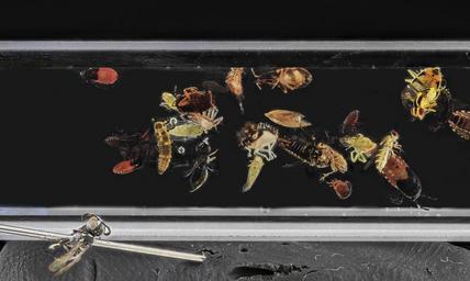 | Keywords: biml usgs droege zerene stacker zerenestacker maryland hand sanitizer handsanitizer cuvette stackshot usgsbiml Experimental Photograph: A collection of tiny 1-2mm inverts (spiderlings, leafhoppers, immature plant bugs and small beetles) mixed into hand sanitizer and placed in a fused quartz cuvette (10mm on a side) and photographed at 1:1 no attempt was made to organize the specimens, but that can easily be done with a thin wire or bent pin. The cuvette rests on black plasticene and a small sphecid wasp (Tachysphex?) is pinned next to it. The point here is to contrast the clarity of the pinned specimen with the specimens that have to go through the optically more distorting walls of the quartz glass and hand sanitizer....specimens come out clearly better than the plastic cuvette, but not nearly as well as the pinned specimen., but on the other hand there is all sort of opportunity to place and manipulate specimens in the hand sanitizer Experimental Photograph: A collection of tiny 1-2mm inverts (spiderlings, leafhoppers, immature plant bugs and small beetles) mixed into hand sanitizer and placed in a fused quartz cuvette (10mm on a side) and photographed at 1:1 no attempt was made to organize the specimens, but that can easily be done with a thin wire or bent pin. The cuvette rests on black plasticene and a small sphecid wasp (Tachysphex?) is pinned next to it. The point here is to contrast the clarity of the pinned specimen with the specimens that have to go through the optically more distorting walls of the quartz glass and hand sanitizer....specimens come out clearly better than the plastic cuvette, but not nearly as well as the pinned specimen., but on the other hand there is all sort of opportunity to place and manipulate specimens in the hand sanitizer |