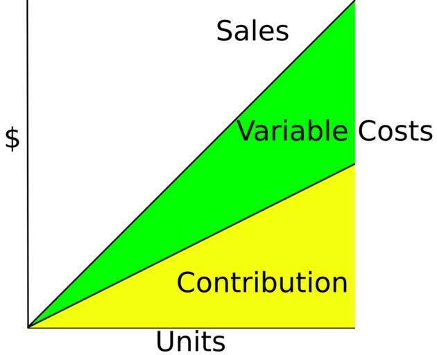 | Keywords: CVP-Sales-Contrib-VC.svg Cost-Volume-Profit diagram showing break down of Sales into Contribution and Variable Costs Self-made in Inkscape Created with Inkscape 2008-02-03 Nils R Barth Translation possible Accounting Cost and revenue curves |