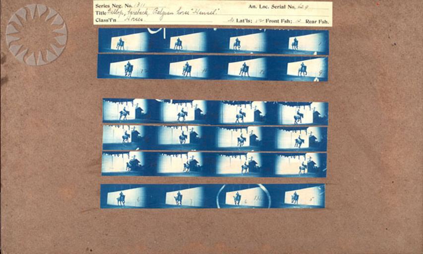 | Keywords: photography physics inventors muybridge smithsonian probably public domain probablypublicdomain SI Neg. 2004-44876. Date: na....Title: "Gallop, bare back; dark gray Belgian Horse 'Dusel'.".Series Neg. No. 1311.An. Loc. Serial No. 629.Classification: "Horses.".Muybridge's cyanotypes are working proofs, the contact prints he made from more than 20,000 negatives he took at the University of Pennsylvania between 1884 and 1886 while photographing human and animal subjects in motion from lateral (parallel), front and rear positions. Since the original negatives no longer exist, the cyanotypes provide us with the opportunity to see the pictures Muybridge achieved before he edited and cropped them for publication..From the Photographic History Collection, National Museum of American History...Credit: Eadweard Muybridge (Smithsonian Institution) SI Neg. 2004-44876. Date: na....Title: "Gallop, bare back; dark gray Belgian Horse 'Dusel'.".Series Neg. No. 1311.An. Loc. Serial No. 629.Classification: "Horses.".Muybridge's cyanotypes are working proofs, the contact prints he made from more than 20,000 negatives he took at the University of Pennsylvania between 1884 and 1886 while photographing human and animal subjects in motion from lateral (parallel), front and rear positions. Since the original negatives no longer exist, the cyanotypes provide us with the opportunity to see the pictures Muybridge achieved before he edited and cropped them for publication..From the Photographic History Collection, National Museum of American History...Credit: Eadweard Muybridge (Smithsonian Institution) |