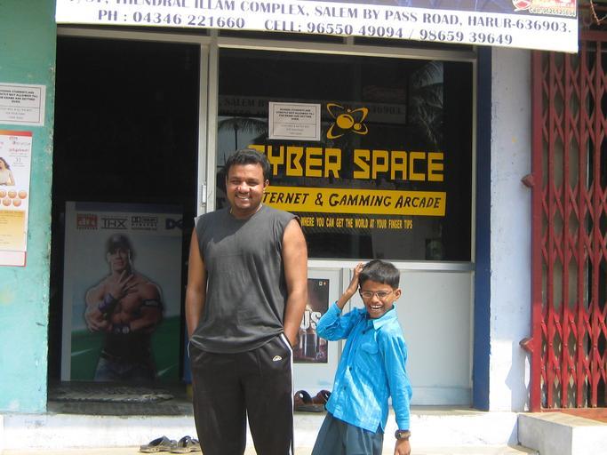 | Keywords: Cyberspace Harur.JPG en Harur's High-tech Internet and Gaming Arcade own Balajikandasami 2009-09 Adults with children Amusement arcades Both hands in pockets Boys of India Harur Male black hair Men looking at viewer Men of India Shops in India Smiling boys Smiling men Two males personality rights |