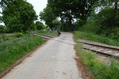 Keywords: Cycleway alongside a railway track near Weye. cyclist crossing eisenbahn railway route bahn cycleway ruralroad fahrradweg