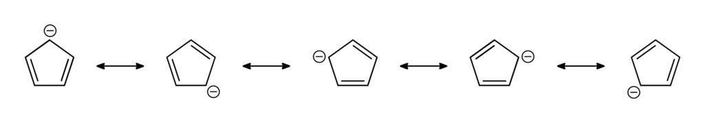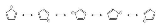 | Keywords: Cyclopentadienide-resonance-2D-skeletal.png Resonance structures of the cyclopentadienide anion Cp<sup> ˆ’</sup> i e C<sub>5</sub>H<sub>5</sub><sup> ˆ’</sup> Structure drawn in http //www cambridgesoft com/software/ChemBioDraw/ ChemBioDraw Ultra 12 0 Own 2010-08-16 Ben Mills Benjah-bmm27 Images by Ben Mills Cyclopentadienide ion Mesomerism |