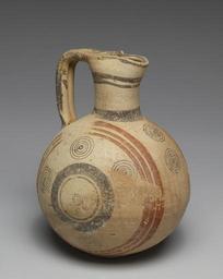| Keywords: Cypriote - Bichrome Ware Jug with Geometric Design and Concentric Circles - Walters 482347 - Three Quarter Right.jpg This example of the popular pinched-spout jug is decorated with red paint on a pale background and is called Bichrome Ware There were two distinct styles of this ceramic ware in Cyprus at this time the rectilinear which features triangles diamonds and rectangles was common in the eastern and southern regions of the island; the circle style shown here with groups of concentric circles was found mostly in the western and northern areas century 7 BC terracotta cm 19 3 accession number 48 2347 15367 William H Smith Alexandria VA Walters Art Museum 1973 by purchase Museum purchase with funds provided by the S A P Fund 1973 place of origin Cyprus Walters Art Museum license Ancient Greek pottery in the Walters Art Museum Ancient Cyprus Media contributed by the Walters Art Museum needs category review Cypriotic bichrome ware |