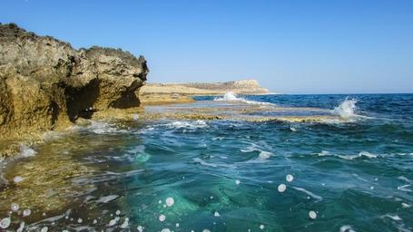 Keywords: cyprus cavo greko rocky coast wave drops foam spray water clear sea blue