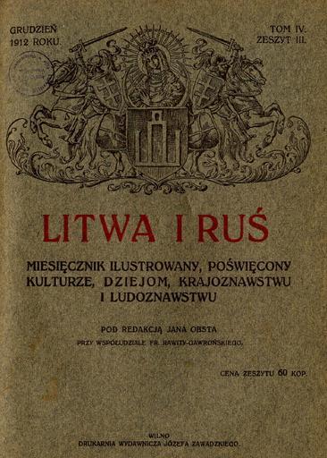 | Keywords: Czasopis - Litwa i Rus - rok 1 - grudzien 1912 - T 4 - z 3.jpg en title page of Litwa i Rus magazine 1912 AD T 4 z 3 ru обложка жу нала Litwa i Rus 1912 г T 4 z 3 be вокладка часопіса Litwa i Rus 1912 г T 4 z 3 reproduction from title page of Litwa i Rus magazine 1912 AD T 4 z 3 editor Jan Obst 1912 AD public domain free Літва і Русь Литва и Русь Западный к ай западные губе нии Заходні к ай заходнія губе ні Western Krai PD-old | ||||