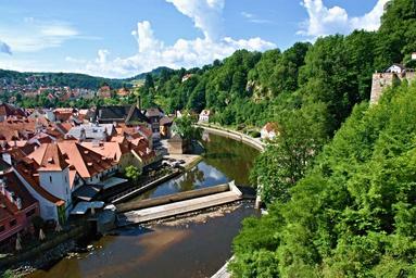 Keywords: czech krumlov view river weir old town landscape south bohemia sun water trees river basin vltava