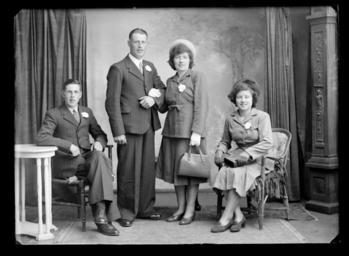 | Keywords: proni cooper h.f. cooper hfcooper family family portrait familyportrait genealogy ancestry ulster strabane northern ireland northernireland county tyrone countytyrone lifford county donegal countydonegal pinstripe suit early 20th century early20thcentury posed formal backdrop painted furniture chair column decorative blackandwhite groupshot people monochrome photo border black and white Creator: H.F. Cooper Photographer, Strabane Date: c.1935 Original Format: Glass Plate Negative Description: Wedding portrait - bride and groom standing, best man and maid of honour seated. PRONI Ref: D1422/B76545/E/6 Copying and copyright: Please see www.proni.gov.uk/index/research_and_records_held/copying_... For Copy Orders, contact: Email: proni@dcalni.gov.uk For fees and charges see: www.proni.gov.uk/index/about_proni/are_there_any_fees_and... Creator: H.F. Cooper Photographer, Strabane Date: c.1935 Original Format: Glass Plate Negative Description: Wedding portrait - bride and groom standing, best man and maid of honour seated. PRONI Ref: D1422/B76545/E/6 Copying and copyright: Please see www.proni.gov.uk/index/research_and_records_held/copying_... For Copy Orders, contact: Email: proni@dcalni.gov.uk For fees and charges see: www.proni.gov.uk/index/about_proni/are_there_any_fees_and... |