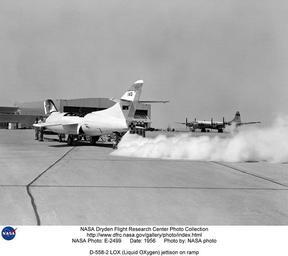| Keywords: D-558-2 LOX (Liquid OXygen) jettison on ramp DVIDS740118.jpg en In this 1956 photograph the Douglas D-558-2 1 is shown venting liquid oxigen LOX The photograph was taken in back of the NACA High-Speed Flight Station's new hangar and building on the main base at Edwards Air Force Base The P2B-1S Superfortress Navy version of the Air Force B-29 launch aircraft is parked in the background The NACA acquired this aircraft on August 31 1951 after Douglas had completed the contract flights The Douglas plant later converted its powerplant to an all-rocket system that required launch from a mothership the P2B-1S Douglas returned the aircraft to the NACA on November 15 1955 The High-Speed Flight Station intended to use it for tests of external stores at supersonic speeds NACA research pilot John McKay made a single flight in the aircraft on September 17 1956 but the NACA subsequently cancelled the program The Douglas D-558-2 Skyrockets were among the early transonic research airplanes like the X-1 X-4 X-5 and X-92A Three of the single-seat swept-wing aircraft flew from 1948 to 1956 in a joint program involving the National Advisory Committee for Aeronautics NACA with its flight research done at the NACA's Muroc Flight Test Unit in Calif redesignated in 1949 the High-Speed Flight Research Station HSFRS Also partners in the flight research were the Navy-Marine Corps and the Douglas Aircraft Co The HSFRS became the High-Speed Flight Station in 1954 and is now known as the NASA Dryden Flight Research Center The Skyrocket made aviation history when it became the first airplane to fly twice the speed of sound The 2 in the aircraft's designation referred to the fact that the Skyrocket was the phase-two version of what had originally been conceived as a three-phase program with the phase-one aircraft having straight wings The third phase which never came to fruition would have involved constructing a mock-up of a combat-type aircraft embodying the results from the testing of the phase one and two aircraft Douglas pilot John F Martin made the first flight at Muroc Army Airfield later renamed Edwards Air Force Base in Calif on February 4 1948 The goals of the program were to investigate the characteristics of swept-wing aircraft at transonic and supersonic speeds with particular attention to pitch-up uncommanded rotation of the nose of the airplane upwards --a problem prevalent in high-speed service aircraft of that era particularly at low speeds during take-off and landing and in tight turns The three aircraft gathered a great deal of data about pitch-up and the coupling of lateral yaw and longitudinal pitch motions; wing and tail loads lift drag and buffeting characteristics of swept-wing aircraft at transonic and supersonic speeds; and the effects of the rocket exhaust plume on lateral dynamic stability throughout the speed range Plume effects were a new experience for aircraft The number three aircraft also gathered information about the effects of external stores bomb shapes drop tanks upon the aircraft's behavior in the transonic region roughly 0 7 to 1 3 times the speed of sound In correlation with data from other early transonic research aircraft such as the XF-92A this information contributed to solutions to the pitch-up problem in swept-wing aircraft The three airplanes flew a total of 313 times--123 by the number one aircraft Bureau No 37973--NACA 143 103 by the second Skyrocket Bureau No 37974--NACA 144 and 87 by airplane number three Bureau No 37975--NACA 145 Skyrocket 143 flew all but one of its missions as part of the Douglas contractor program to test the airplane's performance NACA aircraft 143 was initially powered by a Westinghouse J-34-40 turbojet engine configured only for ground take-offs but in 1954-55 the contractor modified it to an all-rocket air-launch capability featuring an LR8-RM-6 4-chamber Reaction Motors engine rated at 6 000 pounds of thrust at sea level the Navy designation for the Air Force's LR-11 used in the X-1 In this configuration NACA research pilot John McKay flew the airplane only once for familiarization on September 17 1956 The 123 flights of NACA 143 served to validate wind-tunnel predictions of the airplane's performance except for the fact that the airplane experienced less drag above Mach 0 85 than the wind tunnels had indicated NACA 144 also began its flight program with a turbojet powerplant NACA pilots Robert A Champine and John H Griffith flew 21 times in this configuration to test airspeed calibrations and to research longitudinal and lateral stability and control In the process during August of 1949 they encountered pitch-up problems which NACA engineers recognized as serious because they could produce a limiting and dangerous restriction on flight performance Hence they determined to make a complete investigation of the problem In 1950 Douglas replaced the turbojet with an LR-8 rocket engine and its pilot William B Bridgeman flew the aircraft seven times up to a speed of Mach 1 88 1 88 times the speed of sound and an altitude of 79 494 feet the latter an unofficial world's altitude record at the time achieved on August 15 1951 In the rocket configuration a Navy P2B Navy version of the B-29 launched the airplane at approximately 30 000 feet after taking off from the ground with the Skyrocket attached beneath its bomb bay During Bridgeman's supersonic flights he encountered a violent rolling motion known as lateral instability that was less pronounced on the Mach 1 88 flight on August 7 1951 than on a Mach 1 85 flight in June when he pushed over to a low angle of attack angle of the fuselage or wing to the prevailing wind direction The NACA engineers studied the behavior of the aircraft before beginning their own flight research in the airplane in September 1951 Over the next couple of years NACA pilot A Scott Crossfield flew the airplane 20 times to gather data on longitudinal and lateral stability and control wing and tail loads and lift d