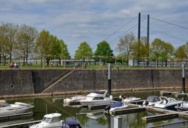 Keywords: düsseldorf port city view anchorage boats yachts architecture