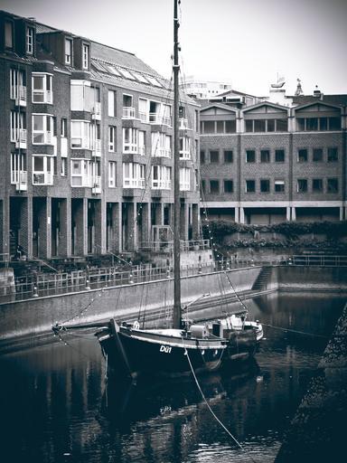 Keywords: düsseldorf port ship city view rhine water harbour area city historically artistically