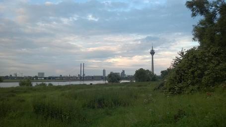 Keywords: düsseldorf rhine bank river germany river landscape tv tower architecture water media harbour landscape niederrhein skyline city view transmission tower rhine meadow blue district rheinbrücke panorama port shipping city building bridge sky clouds sunset harbour area evening landmark nature suspension bridge