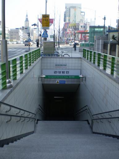 Keywords: Daegu Gyeongdaebyeongwon entrance.jpg An entrance to the subway station for Kyungpook National University Hospital Line 2 in Daegu South Korea Own 2007-01-28 Taken by User Visviva and released into the public domain Daegu Metro Line 2 Stations of DTRO Train stations in Daegu Jung-gu Daegu Railway stations opened in 2005 |