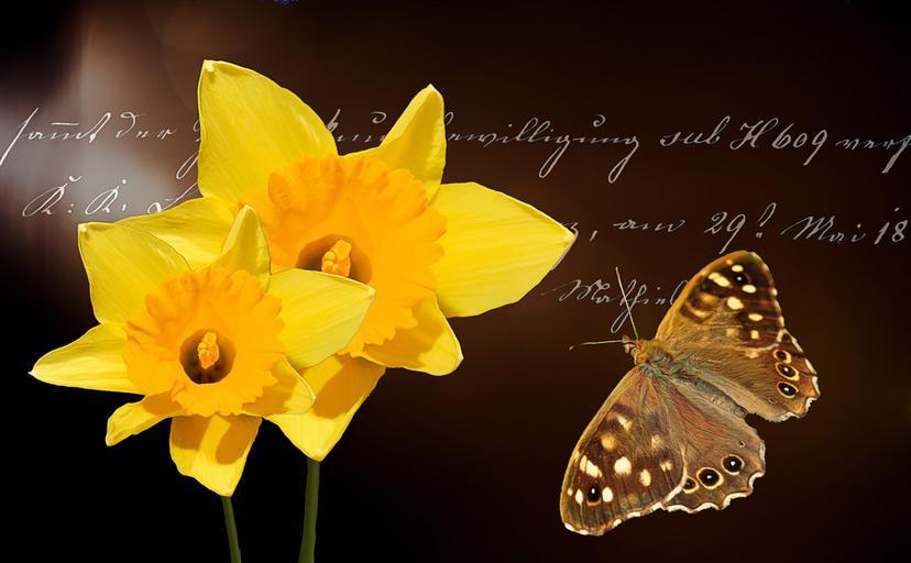 Keywords: daffodils flower flowers yellow plant spring butterfly brown forest board game insect font handwriting digital painting composing digital art