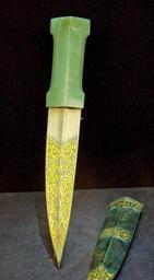 | Keywords: Dagger India Louvre MR13434.jpg Dagger and its scabbard India Blade Damascus steel inlaid with gold; hilt jade; scabbard steel with engraved chased and gilded decoration Dolch und seine Scheide Indien Klinge Damaszener Stahl mit Goldeinlage; Griff Jade; Scheide Stahl dekoriert mit Gravuren Ziselierarbeit und Vergoldung Poignard et son fourreau Lame acier damassé incrusté d'or ; manche jade ; fourreau acier à décor ciselé doré et gravé Pumnal cu teacă artă mogulă din India century 18 steel gilded jade ; steel chased gilt Institution Louvre object department Islamic art room ID 971 35004 object history credit line ProvenanceEvent gift Alexandre-Charles Sauvageot 1856 accession number OA 935 own photo date 2006 Marie-Lan Nguyen artwork license PD-old-100 photo license other versions Islamic metalwork in the Louvre Mughal era daggers Mughal jade Damascus steel Objects with black background Mughal art in the Louvre Museum |