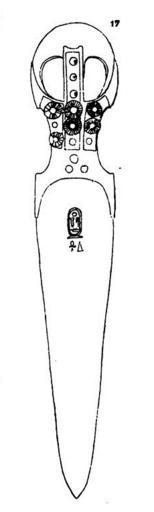 Keywords: Dagger Sewadjenre Petrie.png en Drawing of an ancient Egyptian dagger bearing the name of pharaoh Sewadjenre Nebiryraw I Copper from Hu Diospolis Parva cemeteries tomb Y 237 Reign of Nebiryraw I 16th or 17th Dynasty Second Intermediate Period Cairo JE 33702 1901 Diospolis Parva the cemeteries of Abadiyeh and Hu 1898-9 pl 32 n 17 Flinders Petrie 1853 “ 1942 other versions Custom license marker 2015 11 22 PD-old-auto-1923 1942 Ancient Egyptian weapons Daggers of Africa Works of the 16th dynasty of Egypt Sword drawings Bronze age daggers PD US files by Khruner Egyptian antiquities in the Egyptian Museum Cairo Uploaded with UploadWizard Nebiryraw I |