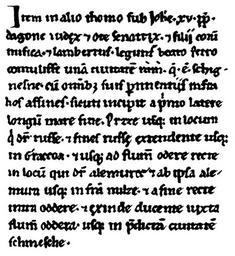 | Keywords: DagomeCambraiCopy.jpg This picture contains a copy of latin text which you can find in medieval codex from second half of 12 century look at Source It's written by transalpine early gothic minuscule or lately carolinian minuscule with gothic elements except first I one from unical For more information see below This copy has been done by pencil HP Photosmart C3180 scaned and MS Paint That's why this copy is not exact but very similar only Codex from Biblioteque Municipale in Cambrai Ms lat 554 f 121<sup>v</sup> Copy was created 2007-02-07 Guncelin Expired Kürbis B Dagome iudex - studium krytyczne PoczÄ…tki paÅ„stwa polskiego KsiÄ™ga tysiÄ…clecia ed K Tymieniecki vol I PoznaÅ„ 2002 reprint ilustration 82 page 377; There is a photo which was taken in 60's by Polska Akademia Nauk <table cellpadding 6> <tr> <td width 269 align center >Latina</td> <td width 271 align center >English</td> <td width 269 align center >Polski</td> </tr> </table> <table cellpadding 6> <td width 272 align justify valign top >Item in alio thomo sub Iohanne ¢ XV ¢ papa ¢ dagone iudex et Ote Senatrix ¢ et filii eorum misica ¢ et lambertus ¢ leguntur beato Petro contulisse unam civitatem in integrum ¢ que ¢ est ¢ schig-nesne ¢ cum omnibus suis pertinentiis infra hos affines ¢ sicuti incipit a primo latere longum mare fine ¢ Przze usque in locum qui dicitur russe ¢ et fines russe extendente usque in Graccoa ¢ et usque ad flumen odere recte in locum qui dicitur alemure; et ab ipsa ale-mura usque intra milze ¢ et afine recte intra oddere ¢ et exinde ducente iuxta flumen oddera ¢ usque in predictam civitatem schinesche ¢</td> <td width 273 align justify valign top >Also in another volume under reign of pope John XV we read that Dagone lord and Ote lady and their sons Mieszko and Lambert were due to grant to saint Peter one entire city or state which is called Schignesne with all its lands in those borders as it begin from first side by cost of the long sea and from there along border of Prussia to the place which is called Rus and straight along border of Rus till Kraków and then till the Oder river straight to the place which is called Alemura and from this Alemura till the land of Milsko and from its border straight under the Oder and from there along the Oder river till mentioned city or state of Shinesche </td> <td width 272 align justify valign top >Podobnie w innym tomie za Jana XV papieża czytamy że Dagome pan i Ote pani i synowie ich Mieszko i Lambert mieli nadać Å›wiÄ™temu Piotrowi w caÅ‚oÅ›ci jedno miasto lub paÅ„stwo które zwie siÄ™ Schignesne z wszystkimi jego przynależnoÅ›ciami w tych granicach tak jak siÄ™ zaczyna od pierwszego boku dÅ‚ugim morzem stÄ…d granicÄ… Prus aż do miejsca które siÄ™ nazywa RuÅ› a granica Rusi ciÄ…gnÄ…c aż do Krakowa a potem aż do rzeki Odry prosto do miejsca które zwie siÄ™ Alemura a od tejże Alemury aż po ziemiÄ™ Milsko a od jego granicy prosto pod OdrÄ™ i stÄ…d prowadzÄ…c wzdÅ‚uż rzeki Odry aż do rzeczonego miasta lub paÅ„stwa Schinesche </td> </tr> </TABLE> ---- This text was copied especially for one paragraph 7th on folia 121<sup>v</sup> which is mainly known as Dagome Dagone iudex This is a piece of canonical work called Collectio canonum The reason is that it is a very important text for polish history where it's used to fixing many things from the erliest times of Poland However we don't know how it looked oririginally and we have only six different copies of that you can see copy number 4 on the picture That's why there are many studies which tries to deduce real appearance of this by copies comparision Very important thing is dependence between copies and which one has delivered the best forms Here is a filiation diagram where copy on the picture is marked by blue; - 10 2 <center> 6 Codex from Vatican Library<br/>Liber Censuum<br/>Cod Vatic lat 8496; 2 2 <center> 5 Codex from Vatican Library<br/>Codex Ottobonianus<br/>Ms lat 3057; - 11 4 style border-bottom 1px black solid; border-left 1px black solid; border-left 1px black solid; - 13 2 style border-left 1px black solid; - 8 ABF2FF colspan 2 <center> 4 Codex from Municipal Library of Cambrai<br/>Codex Cameracensis<br/>Ms lat 554; 2 2 <center> Albinus bishop of Albano<br/>Gesta Albini<br/> between 1185 and 1198 lost; - 8 border-right 1px black solid; 4 style border-bottom 1px black solid; border-right 1px black solid; - 2 <center> 1 Codex from Vatican Library<br/> Cod Vatic lat 3833; 2 <center> 2 Codex from Vatican Library<br/> Cod Vatic lat 1984; 1 2 <center> 3 Codex from National Library of France<br/> Ms lat 1458; 4 3 style border-left 1px black solid; - border-right 1px black solid; 2 style border-bottom 1px black solid; border-right 1px black solid; 3 style border-bottom 1px black solid; border-right 1px black solid; center 4 2 <center> Benedict canon<br/>Liber Politicus<br/> between 1140 and 1143 lost; - 3 style border-right 1px black solid; 8 style border-bottom 1px black solid; 3 style border-left 1px black solid; - 8 style border-right 1px black solid; 7 - 7 14 7 14 7 14 7 14 7 14 7 14 7 14 7 14 7 14 7 14 7 14 7 14 7 14 7 14 - width 100 ; text-align center; vertical-align top; cellspacing 0 cellpadding 0 - style vertical-align top; 2 style vertical-align middle; Deusdedit cardinal<br/>Collectio canonum<br/> about 1087 lost;<br/>Dagome iudex<br/>in original; 2 - Dagome Iudex |