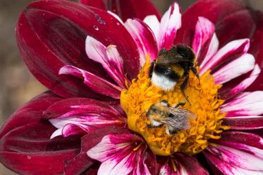 Keywords: dahlia hortensis hummel blossom bloom macro insect flower animal close dahlia neck frills-dahlia