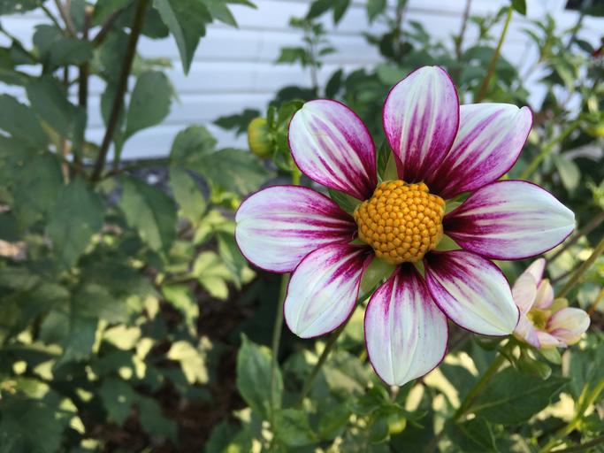 Keywords: dahlia mii tai purple and white petals yellow center flora blossom nature garden