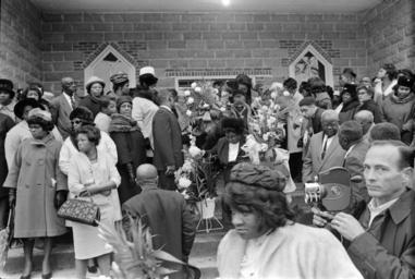 | Keywords: ms-dept-archives-history msdeptarchiveshistory moncrief mdah:sysid=94899 blackandwhite people monochrome crowd indoor black and white Collection: Moncrief Photograph Collection Call number: PI/1994.0005 System ID: 94899. Link to the catalog Vernon Dahmer funeral, Shady Grove Baptist Church, Kelly Settlement (Hattiesburg, Miss.), afternoon of January 15, 1966. Mourners on church steps. Scanned as TIFF in 2005-06-21 by MDAH. Credit: Courtesy of the Mississippi Department of Archives and History. Collection: Moncrief Photograph Collection Call number: PI/1994.0005 System ID: 94899. Link to the catalog Vernon Dahmer funeral, Shady Grove Baptist Church, Kelly Settlement (Hattiesburg, Miss.), afternoon of January 15, 1966. Mourners on church steps. Scanned as TIFF in 2005-06-21 by MDAH. Credit: Courtesy of the Mississippi Department of Archives and History. |