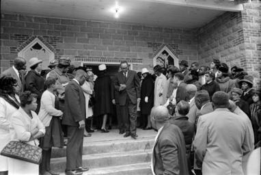 | Keywords: ms-dept-archives-history msdeptarchiveshistory moncrief mdah:sysid=94832 blackandwhite monochrome black and white Collection: Moncrief Photograph Collection Call number: PI/1994.0005 System ID: 94892. Link to the catalog Vernon Dahmer funeral, Shady Grove Baptist Church, Kelly Settlement (Hattiesburg, Miss.), afternoon of January 15, 1966. Funeral party exits church. Scanned as TIFF in 2005-06-21 by MDAH. Credit: Courtesy of the Mississippi Department of Archives and History. Collection: Moncrief Photograph Collection Call number: PI/1994.0005 System ID: 94892. Link to the catalog Vernon Dahmer funeral, Shady Grove Baptist Church, Kelly Settlement (Hattiesburg, Miss.), afternoon of January 15, 1966. Funeral party exits church. Scanned as TIFF in 2005-06-21 by MDAH. Credit: Courtesy of the Mississippi Department of Archives and History. |