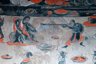 | Keywords: Dahuting mural detail of a dancer, Eastern Han Dynasty.jpg en The Dahuting Tomb Chinese 打虎亭汉墓 Pinyin Dahuting Han mu; Wade-Giles Tahut'ing Han mu of the late Eastern Han Dynasty 25-220 AD located in Zhengzhou Henan province China was excavated in 1960-1961 and contains vault-arched burial chambers decorated with murals showing scenes of daily life <br>For further information see the Baidu article in Chinese http //baike baidu com/view/230941 htm 打虎亭汉墓 <br>http //blog sina com cn/s/blog_53928e100102voyg html Click here for more pictures and a step-by-step walkthrough of the tomb from the outside down a stairwell and through the vaulted burial chambers Late 2nd early 3rd century AD http //news sina com cn/c/2004-08-25/08044129741 shtml News sina com cn<br> http //www zzldcn cn/Panoramic/Pages/91_1621 html Zzldcn cn National Cultural Information Resources Sharing Project Zhengzhou Branch<br> http //bbs photofans cn/blog php mod view_mob id 56507 Bbs photofans cn<br> https //www synotrip com/henan-province/sky-han/dahuting-han-dynasty-tombs Synotrip com Henan Province<br> https //www tripadvisor com/LocationPhotoDirectLink-g1152494-d1834409-i158766092-Dahuting_Tomb_of_Han_Dynasty-Xinmi_Henan html Tripadvisor com<br> Ancient Chinese artists of the late Eastern Han period other versions Custom license marker 2016 10 11 PD-Art-100 Dahuting Tomb murals Dancers in art Musicians in art Banquets in art Lacquerware of the Han Dynasty |
