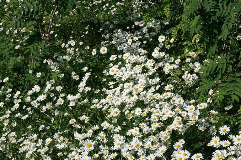 Keywords: daisies daisy flowers white green leaves plants ferns green background wild gardens gardening nature natural environment floral flowering ornamental valleys fields blossoms blooms blooming outdoors