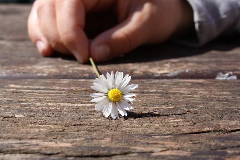 Keywords: daisy flower hand connectedness wood table luck satisfaction still life