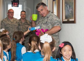 | Keywords: girl scouts girlscouts people Girl Scout Daisy Troop 3390 hosted a "Troops to Troops," cookie delivery event. The group delivered 200 boxes of cookies to Airmen of the 136th Airlift Wing, August 27, 2016, Naval Air Station Fort Worth Joint Reserve Base, Texas. Girl Scout Daisy Troop 3390 hosted a "Troops to Troops," cookie delivery event. The group delivered 200 boxes of cookies to Airmen of the 136th Airlift Wing, August 27, 2016, Naval Air Station Fort Worth Joint Reserve Base, Texas. |