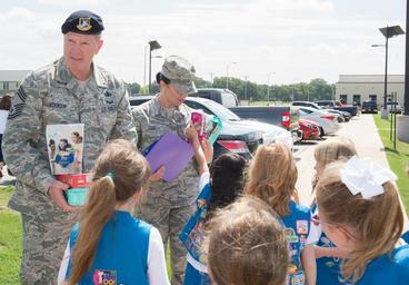 | Keywords: girl scouts girlscouts outdoor Girl Scout Daisy Troop 3390 hosted a "Troops to Troops," cookie delivery event. The group delivered 200 boxes of cookies to Airmen of the 136th Airlift Wing, August 27, 2016, Naval Air Station Fort Worth Joint Reserve Base, Texas. Girl Scout Daisy Troop 3390 hosted a "Troops to Troops," cookie delivery event. The group delivered 200 boxes of cookies to Airmen of the 136th Airlift Wing, August 27, 2016, Naval Air Station Fort Worth Joint Reserve Base, Texas. |